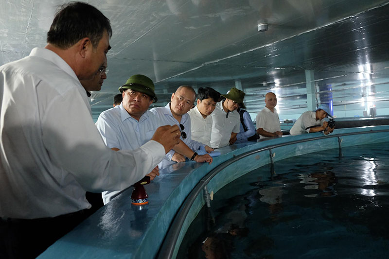 Bộ trưởng tham quan mô hình sản xuất giống thủy sản công nghệ cao Ông Lê Hữu Tình, Phó Giám đốc Công ty báo cáo về các dự án Công ty đang thực hiện