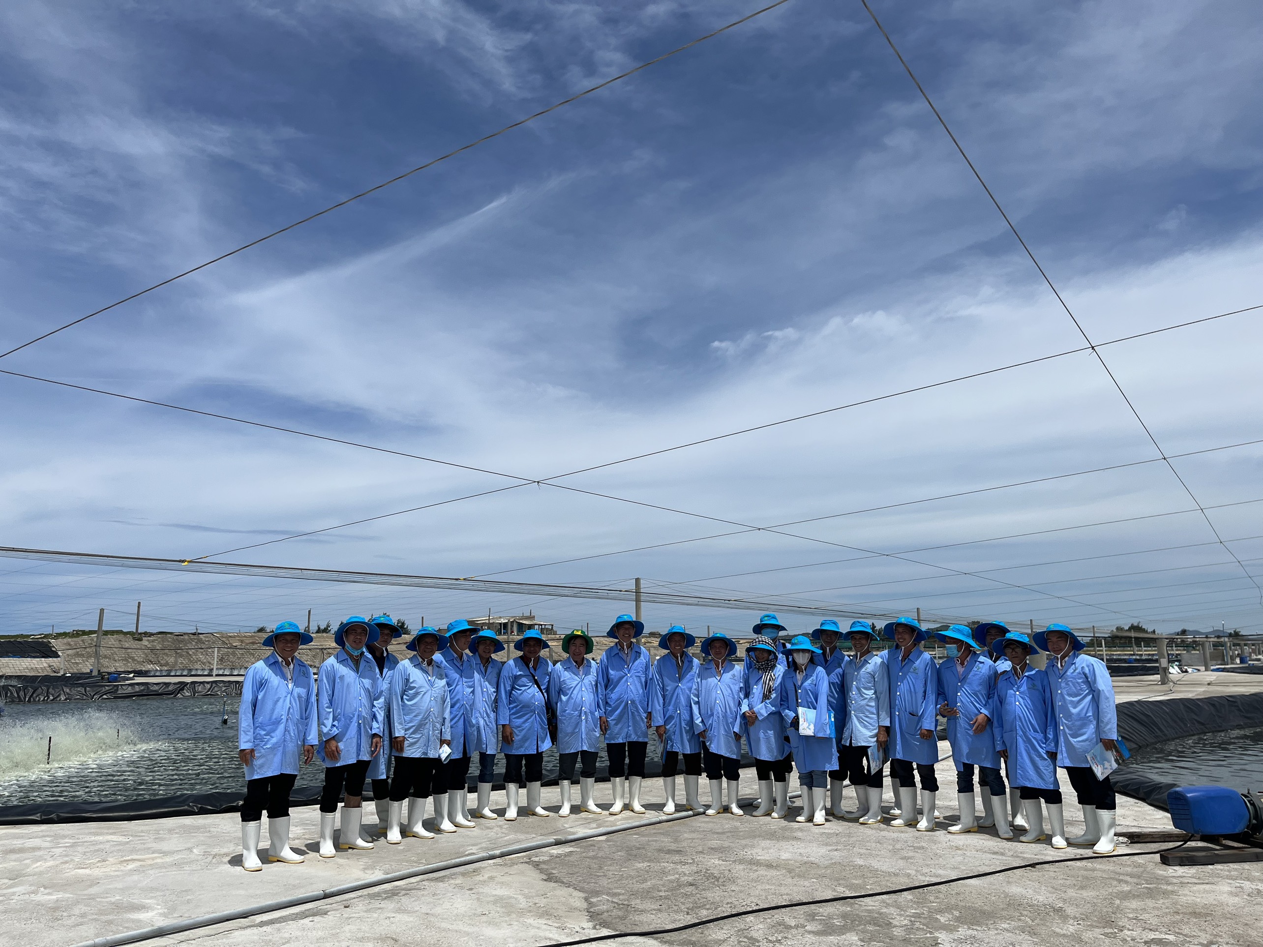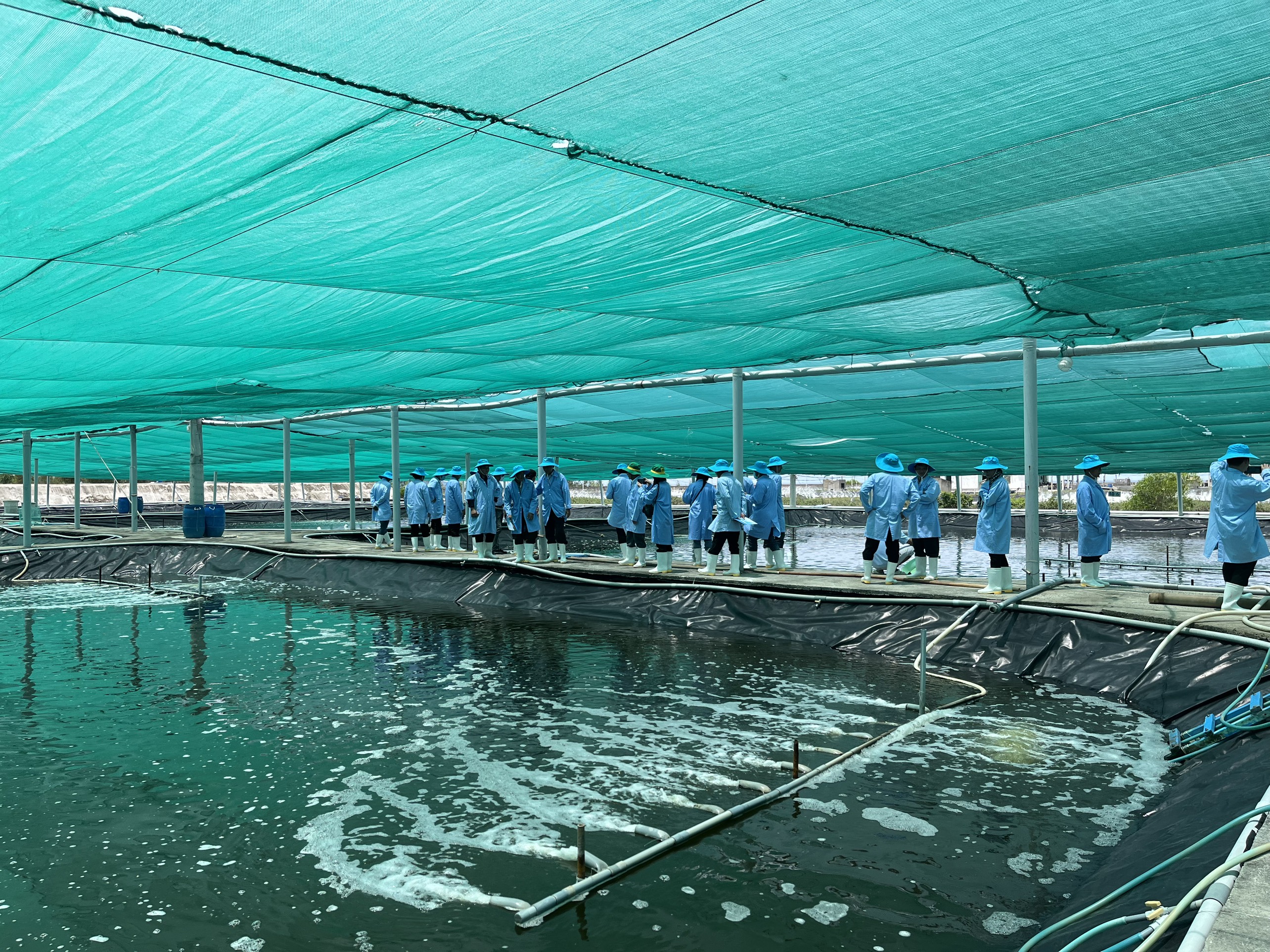 Chia sẻ với đoàn, đại diện Công ty Đắc Lộc - đơn vị được Tổng cục Thủy sản, Bộ NN-PTNT giao chủ trì, thực hiện thành công dự án: "Nghiên cứu hoàn thiện quy trình công nghệ nuôi thương phẩm tôm thẻ chân trắng trên cát bằng nước biển ven bờ ở miền Trung đảm bảo an toàn thực phẩm và an toàn dịch bệnh", cho biết công ty xây dựng và duy trì các tiêu chuẩn quốc tế Global GAP, ASC từ năm 2013 đến nay. Đang xây dựng cơ sở sản xuất giống và nuôi thương phẩm an toàn dịch bệnh theo OIE và thông tư 14/2016 BNN&PTNT. 6 tháng đầu năm 2022, tuy vẫn chịu tác động của dịch bệnh Covid-19… nhưng đơn vị vẫn duy trì sản xuất được 200.000.000 con tôm giống, sản xuất được 1.400 tấn tôm nguyên liệu. Để nuôi tôm thích ứng biến đổi khí hậu hiện nay, việc xây hệ thống nhà màng cho ao nuôi là rất cần thiết. Ông Lê Hồng Duyệt - Trưởng bộ phận nuôi tôm thực nghiệm cho biết thêm “Ứng dụng nhà màng, thứ nhất giúp kiểm soát, hạn chế dịch bệnh, thứ hai giúp cho việc kiểm soát biến động thời tiết, nhiệt độ tốt hơn nhằm ổn định môi trường ao nuôi, nâng cao hiệu quả trong nuôi tôm...).